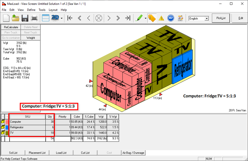 Load a full container of specified SKUs in a set ratio. For instance, specify a ratio of 4:2:1 and MaxLoad will optimize the container with 4 chairs and 2 coffee tables for every sofa loaded. MaxLoad Pro will maintain that ratio for the entire truck or container.