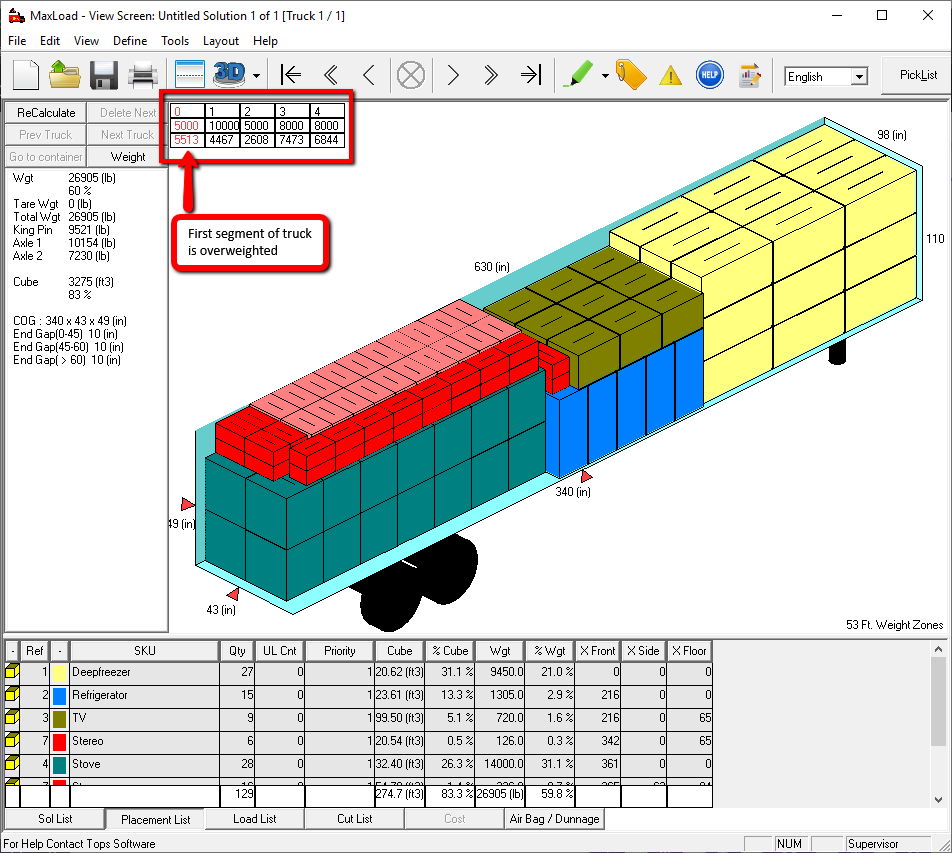 There are special ways of calculating based on weight, too. For example, we have two loading algorithms (Flatbed and Load Floor to Ceiling) that load items in full layers from the bottom of the trailer, up. These are good for very heavy items that need to be spaced out along the floor. We also have an option for calculating using “Weight Segments” in the vehicle. When defining your vehicle, you can specify regions of the container and weight limits for each region. Then, when MaxLoad calculates your solutions, the weights in each section will be displayed. If any section is carrying too much weight, it will be shown in red.