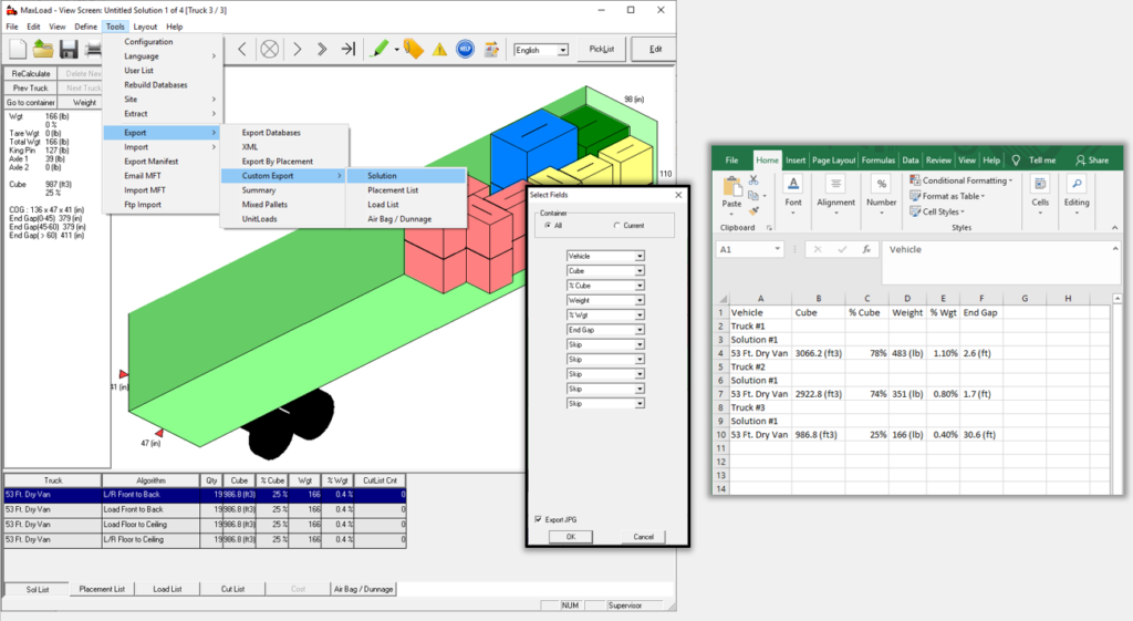 MaxLoad’s calculation results (including cubic space & floor space utilization) can also be exported to Excel, or to SQL Database tables for integration with other programs. For customers calculating large amounts of freight or pre-planning many loads in advance, this can be a very valuable tool.