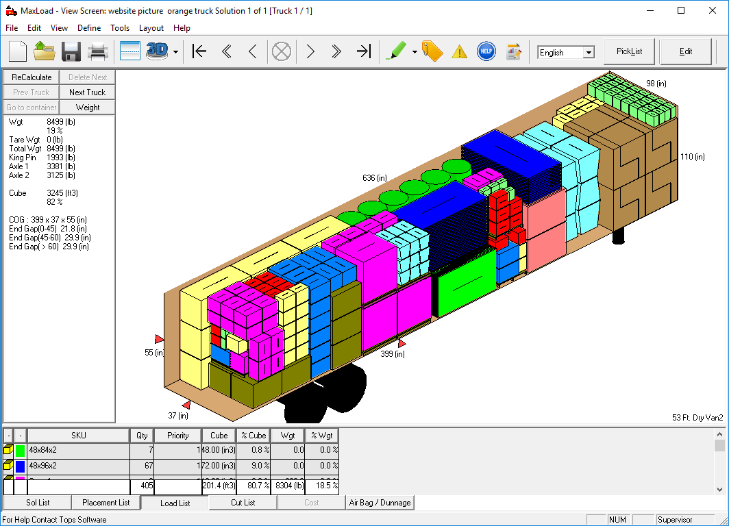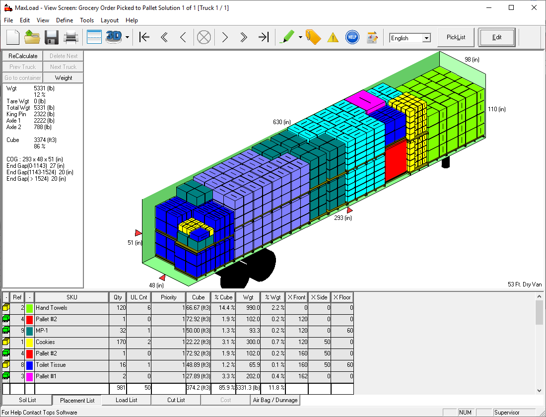With 3D load diagrams, get actual calculations, not estimates for stable layer mixed pallets.